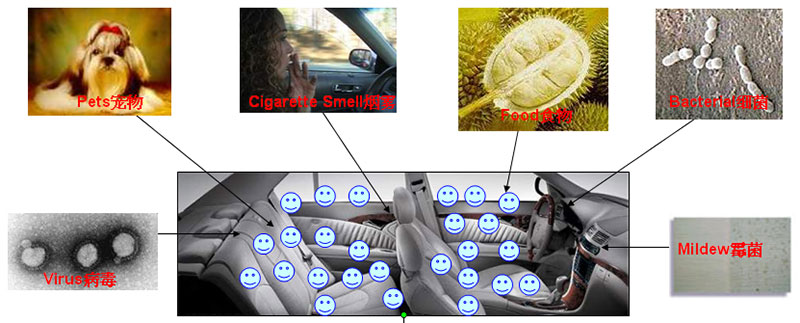 可消除汽车内饰散发出的挥发性有机化合物(TVOC),祛除车内物品、二手烟、汽车发动机产生的一氧化碳、汽油等带来的异味和细菌,同时净化汽车空调系统,提高汽车内的空气质量。
