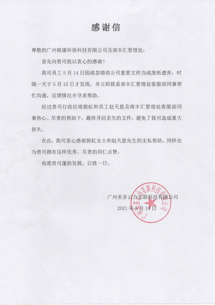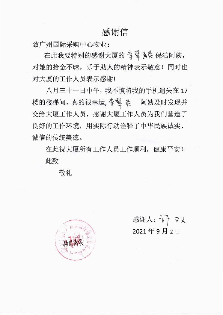收到北京戴德梁行物业管理有限公司广州分公司南丰汇环球展贸中心物业管理处的表扬信
